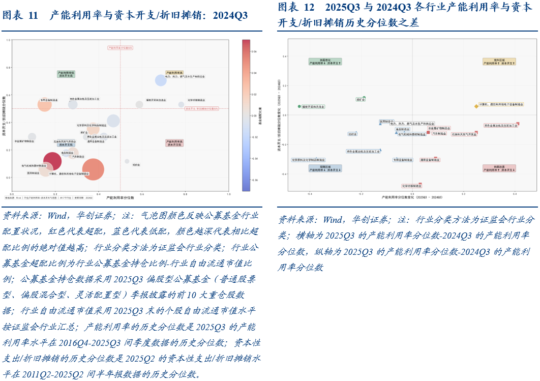 我们将2025Q3与2024Q3的行业产能利用率以及资本开支/折旧摊销历史分位数对比,可以发现过去一年来较多行业的供需格局演变呈现出需求普遍疲软、投资意愿减弱的特点。根据过去一年来产能利用率以及资本开支/折旧摊销的变化,我们也可以将各行业分为四个象限:
