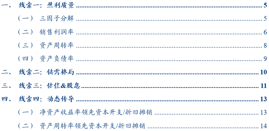 我们聚焦2025Q3万得全A的盈利分析,通过杜邦分解和供需格局等视角,寻找上市公司盈利数据背后的宏观线索,以辅助宏观经济的跟踪与研判,可以发现:1)ROE的企稳主要靠销售净利率提升(费用控制)支撑,但销售毛利率持续承压,说明宏观需求偏弱的背景下企业更多依赖“节流”而非“开源”来稳定盈利;此外,从资产周转率和资产负债率来看,上市公司运营效率有所改善,同时杠杆水平维持稳定。2)我们通过产能利用率与资本开支/折旧摊销来观察行业供需格局,观察到17个行业中有10个行业处于产能利用率低且资本开支/折旧摊销低的状态,在宏观上意味着多数行业处于当前供需格局较差但未来将改善的状态。3)从估值/股息视角,我们根据“估值-股息”四象限梳理不同行业在当前宏观环境下的相对位置,以此作为观察市场风险偏好的基准。过去一年33个行业中有24个呈现“估值升、股息降”的特征,这一微观结构的变化,侧面印证了宏观层面市场风险偏好在过去一年的边际提升。4)从动态传导视角看,通过历史数据回溯,我们验证了微观盈利改善向宏观投资传导的时滞规律,即ROE和资产周转率改善普遍领先于资本开支(滞后半年至一年),有助于我们根据盈利修复进度研判宏观资本开支周期的启动时间。