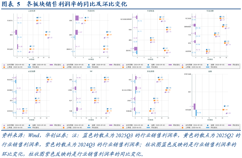 我们将中信一级行业划分为8个板块,然后对比了各板块细分行业在2025Q3的销售毛利率的环比和同比变化,可以发现: