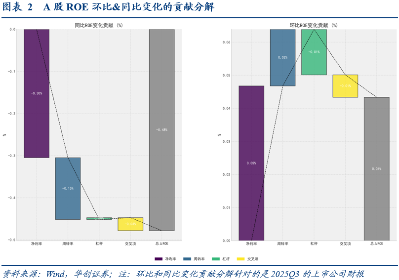 2025年第三季度,万得全A(除金融、石油石化)的盈利能力(ROE)实现了增长,从年中的6.32%增长至三季度末的6.37%。通过对ROE的杜邦分解以及贡献分解,可以看出ROE的环比提升主要源于销售净利率的抬升,考虑到毛利率过去两个季度仍在下行,实际上受益于费用的有效控制。