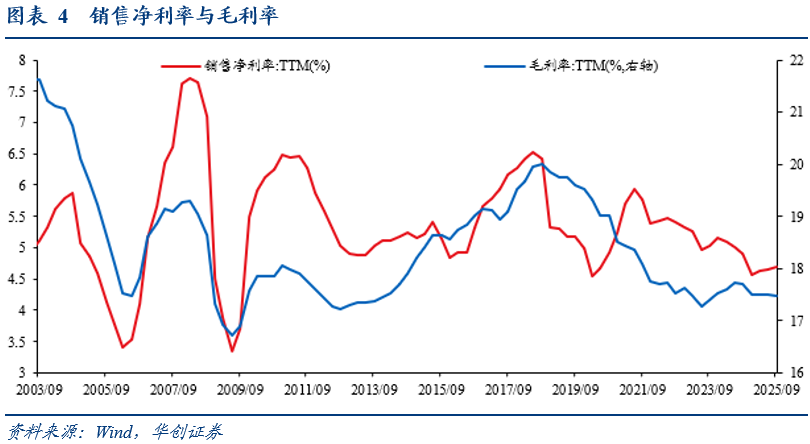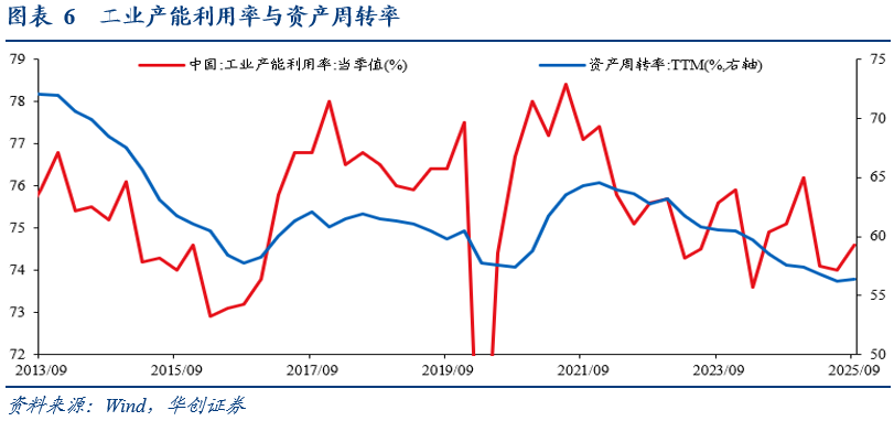 2021Q4以来A股资产周转率总体持续回落,但2025Q3资产周转率相比2025Q2的56.21%回升了0.15个百分点,与此同时,2025Q3的工业产能利用率也相比2025Q2的74.0%回升了0.6个百分点。无论是资产周转率还是产能利用率,都反映了行业供需格局的状态,且在2025Q3出现了边际改善的信号。