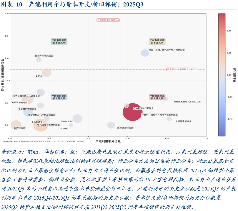 总结来看,2025Q3有超过三分之二的行业产能利用率低于历史中位数,反映出经济中需求不足的问题或依旧突出;而资本开支较高的行业主要集中在资源能源和公用事业领域,如电力、煤炭。从供需格局的角度看,需要注意风险的行业是低产能利用率与高资本开支结合的行业,即煤炭开采和洗选业;供需格局有望持续改善的行业则是高产能利用率与低投资结合的行业,如化学纤维、黑色金属、油气开采、电子设备制造业等。