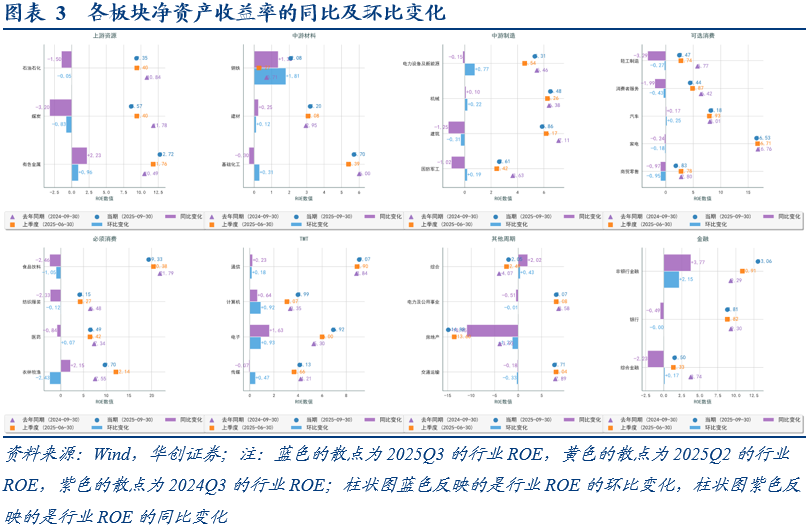 我们将中信一级行业划分为8个板块,然后对比了各板块细分行业在2025Q3的ROE的环比和同比变化,可以发现:ROE环比和同比改善的板块主要在TMT、中游材料以及中游制造板块,包括通信、计算机、电子、钢铁、建材以及机械等行业。