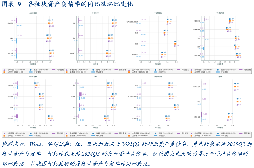 我们将中信一级行业划分为8个板块,然后对比了各板块细分行业在2025Q3的资产负债率的环比和同比变化,可以发现: