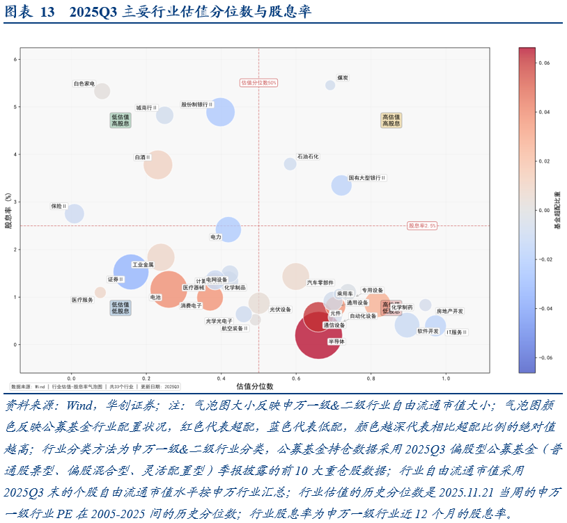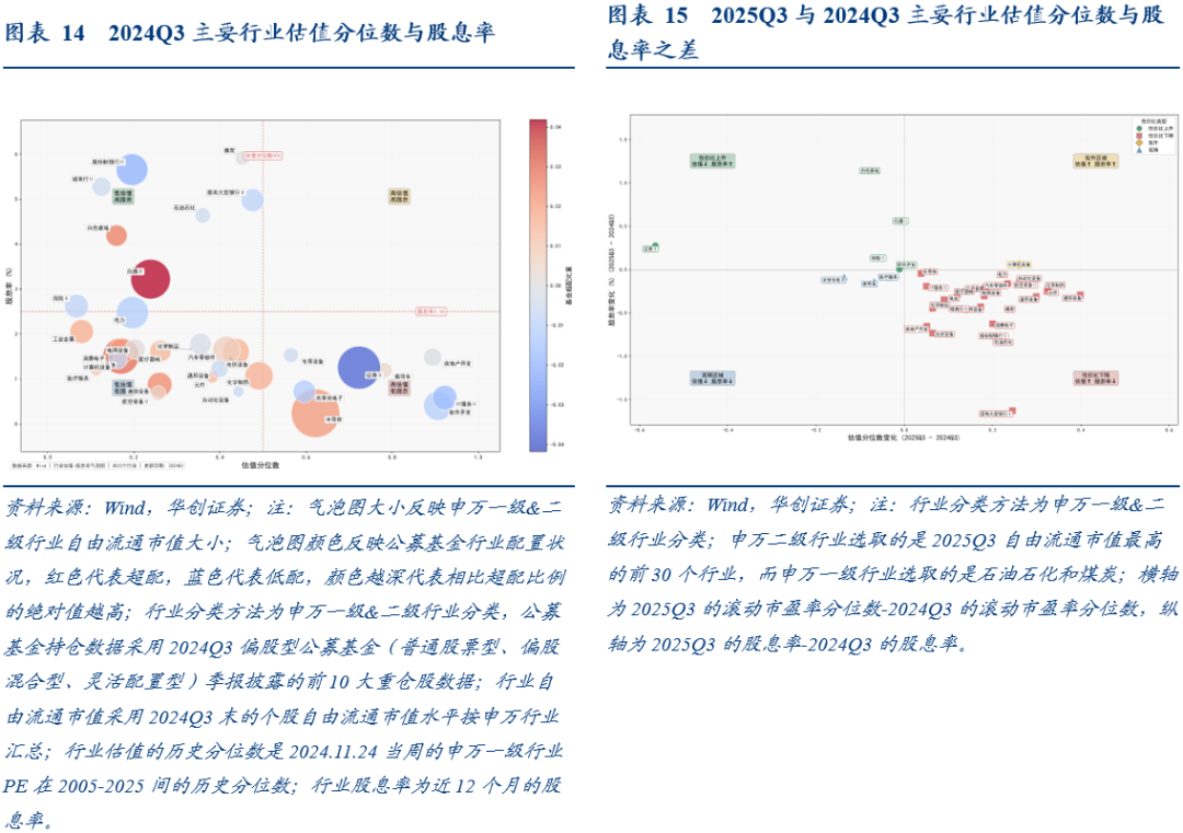 对比2024Q3和2025Q3的PE分位数以及股息率,可以发现过去一年A股主要申万二级行业估值普遍上升而股息率普遍下降。具体来看,33个行业中有25个行业的估值分位数上升,同时有27个行业的股息率下降,表明市场风险偏好提升,资金流向增长型行业,股价上涨导致股息率被动下降,反映了政策支持下的市场风险偏好抬升。仅有少数行业出现了价值修复,如证券Ⅱ、白酒Ⅱ、保险Ⅱ、白色家电和软件开发出现估值下降且股息率上升,配置性价比和安全边际提升。