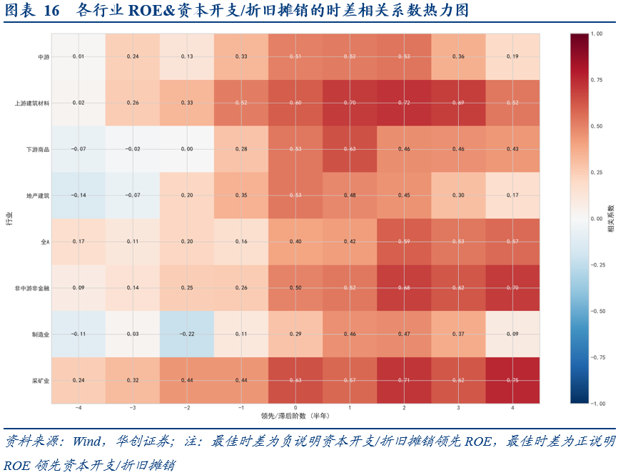 我们统计了2005~2025年间万得全A、中游、上游建筑材料、下游商品、地产建筑、非中游非金融、制造业以及采矿业的资本开支/折旧摊销与ROE的时差相关系数,可以发现对于大多数行业而言,盈利能力的改善(ROE提升)领先并驱动着后续的资本开支,并且不同行业的领先时长揭示了其产业链位置。