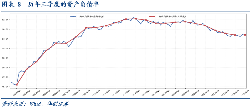 (四)资产负债率2023Q4以来,A股的资产负债率保持了高度的稳定,始终在58.2%至58.7%的区间内波动,表明A股上市公司的资本结构相对稳健。考虑到资产负债率存在明显的季节效应,我们如果只统计历年三季度的资产负债率,可以看到2025Q3是疫情以来首次看到资产负债率出现企稳的迹象。