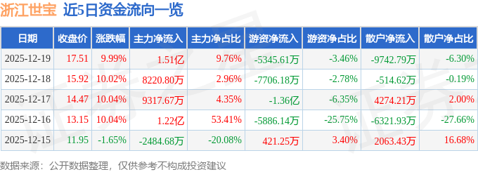 12月19日的资金流向数据方面,主力资金净流入1.51亿元,占总成交额9.76%,游资资金净流出5345.61万元,占总成交额3.46%,散户资金净流出9742.79万元,占总成交额6.3%。