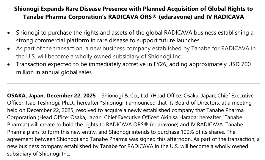 12月22日,盐野义宣布计划收购田边制药的肌萎缩侧索硬化症(ALS,俗称“渐冻症”)药物业务板块,其中核心资产包括口服混悬剂Radicava ORS及其静脉注射剂型,同时涵盖相关商业化运营能力。