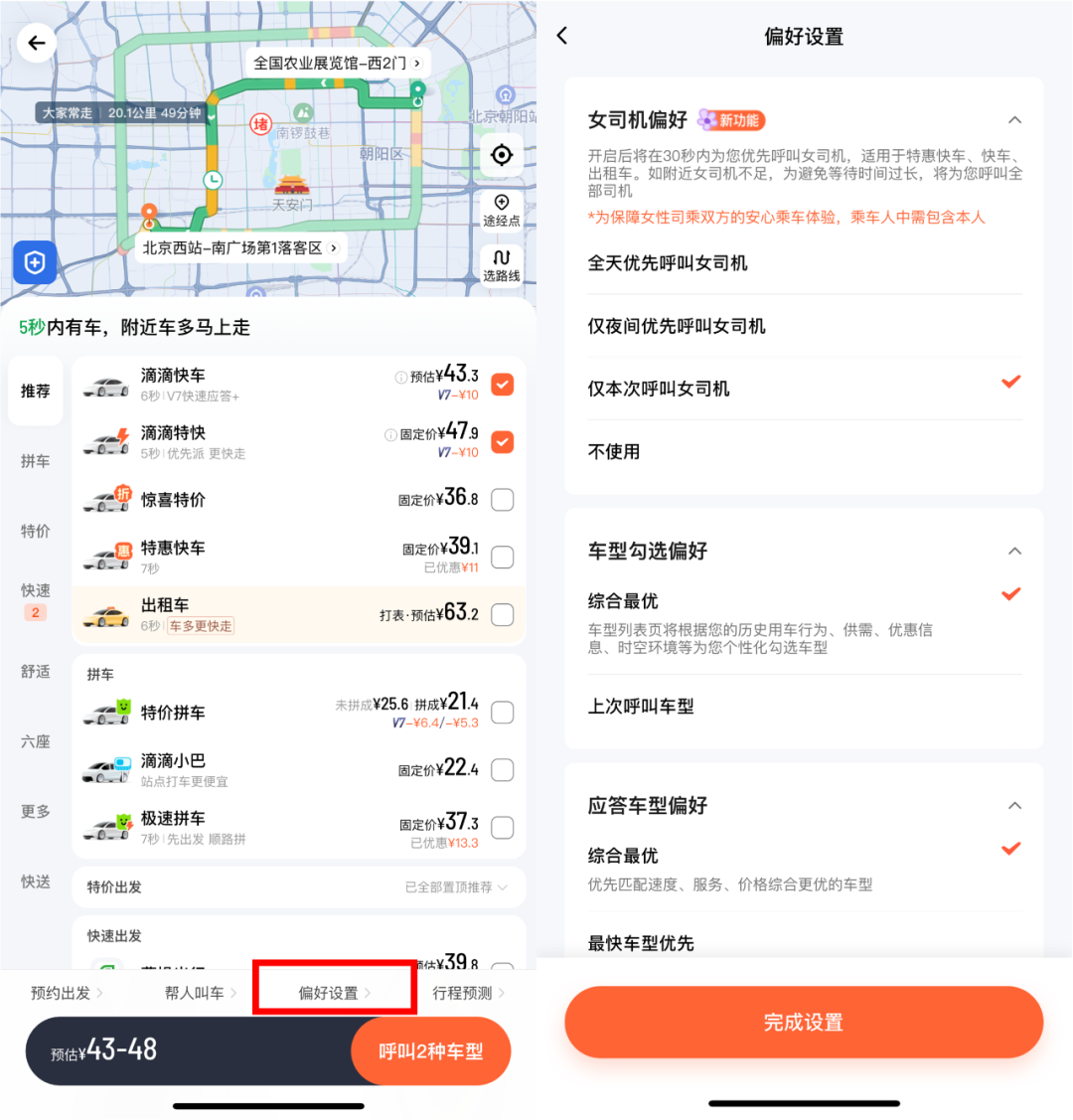 已实名女乘客可以在打车页面中,点击“偏好设置”,根据个人需求来设置“全天/夜间/仅本次/不使用”优先呼叫女司机功能。同时,女司机也可以根据自身接单意愿,选择加入/退出“优先接女乘客”。