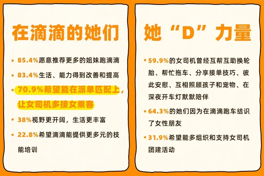 调研显示,成为滴滴女司机后,83.4%的人觉得生活水平、个人能力得到了改善和提高,64.3%的人在跑车过程中结识了其他女性朋友,职业认同与社会连接同步增强。