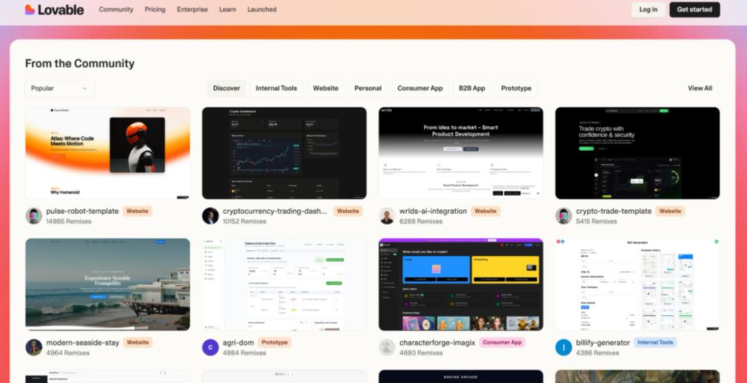 Lovable将用户视为“增长合伙人”,通过设计极具传播性的产品体验,鼓励用户主动分享自己用Lovable构建的店铺、工具或个人项目。每一个用户案例都成为信任的新节点,驱动着增长飞轮的高速运转。