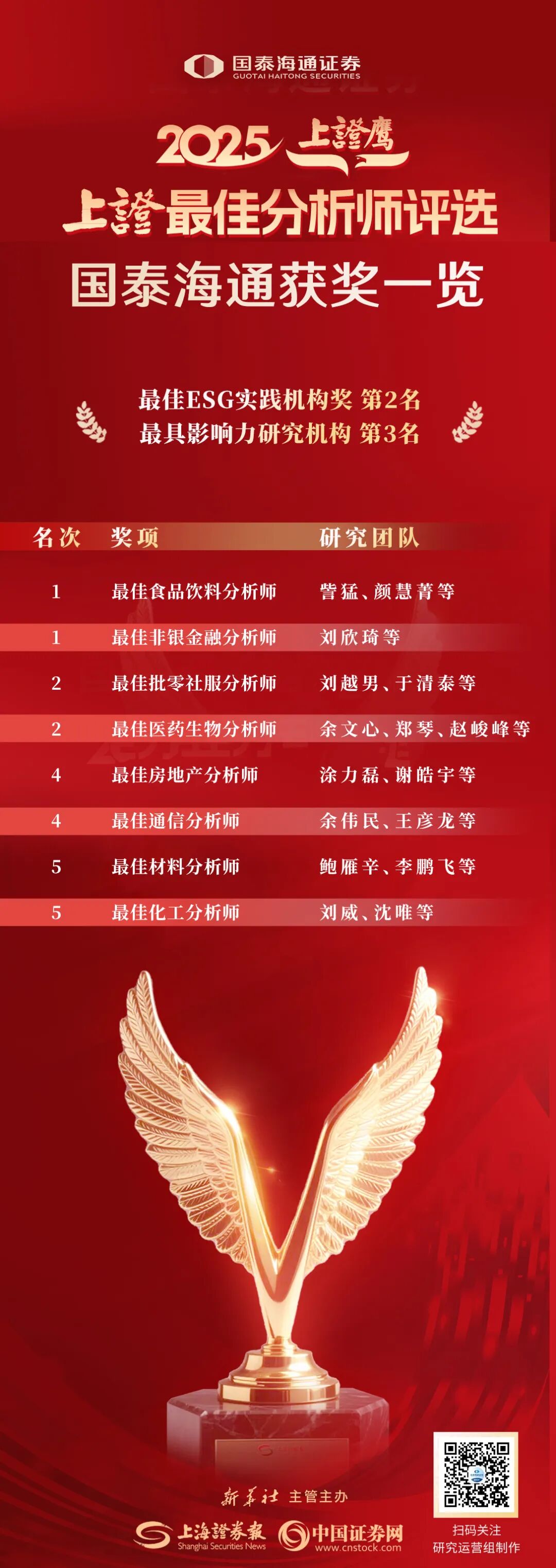 2025上证鹰·上证最佳分析师榜单正式出炉,国泰海通获10项大奖,详情如下: