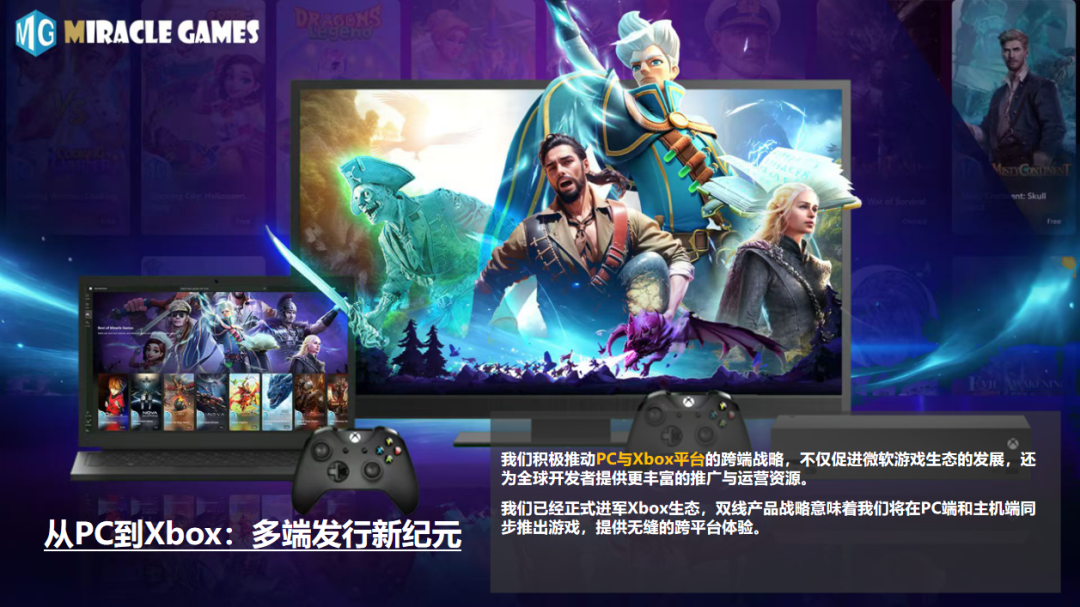 同时,我们积极推动PC与Xbox平台的跨端战略,不仅促进微软游戏生态的发展,还为全球开发者提供更丰富的推广与运营资源。我们已经正式进军Xbox生态,双线产品战略意味着我们将在PC端和主机端同步推出游戏,提供无缝的跨平台体验。