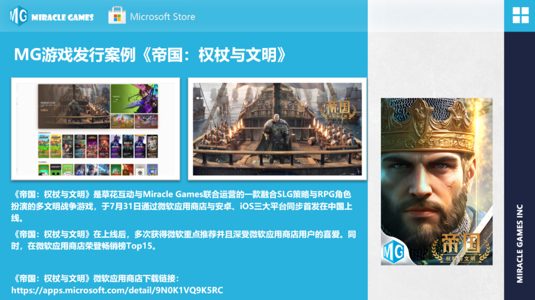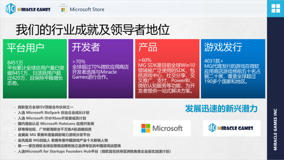北京奇游灵动科技有限公司(MIRACLE GAMES INC)于2016年成立,专注于Microsoft Store终端应用与游戏推广运营的服务平台,由微软孵化,同时也是微软一直扶持起来的合作伙伴,我们以“赋能开发者,联结玩家,构筑乐趣世界”为使命,始终致力于推动微软游戏生态在中国市场的普及,帮助开发者在 Windows 等平台上获得用户和快速变现。