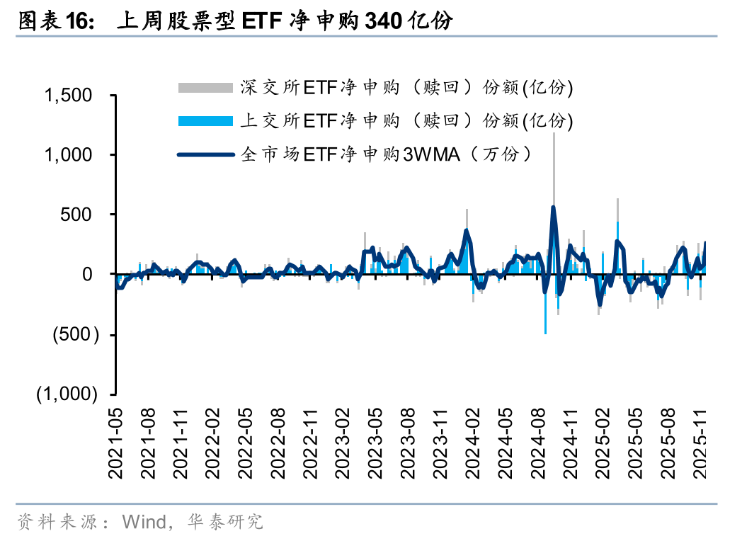 上周前两个交易日,A股受海内外扰动走势偏弱,上证指数回落至3800点附近,但周三起以宽基ETF为代表的左侧资金净流入提振市场情绪,沪深300ETF和中证A500ETF的成交量和基金份额大幅提升,我们认为:1)中证A500ETF头部产品12月以来净流入超300亿元,或与未来期权标的的博弈相关;2)上周三,沪深300 ETF头部产品净流入或与配置型资金建仓有关,市场在阶段性低位或仍具备一定资金韧性。
