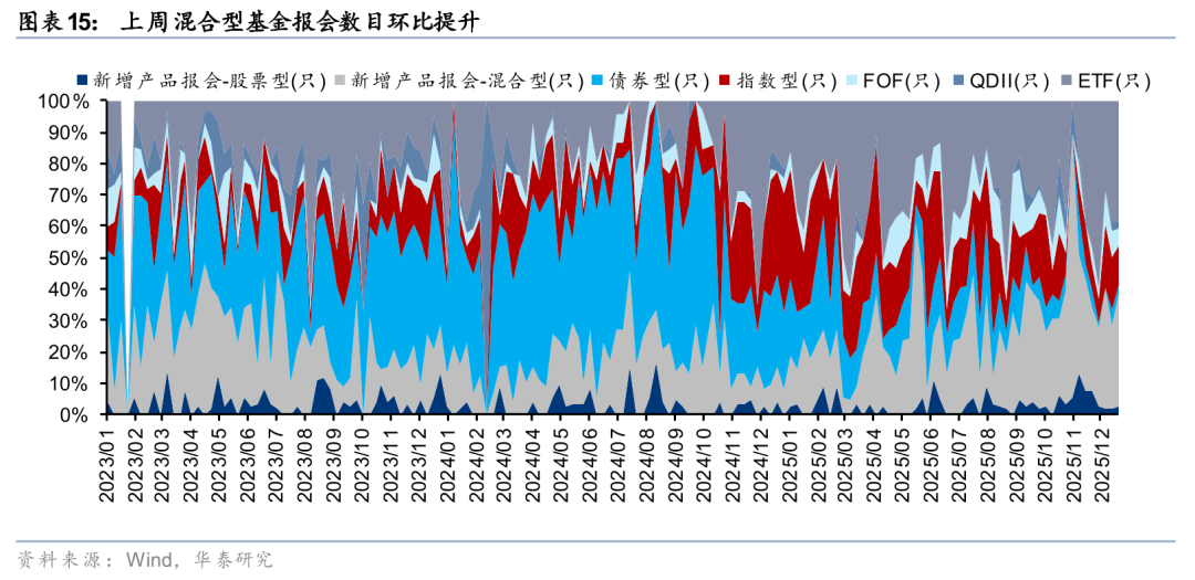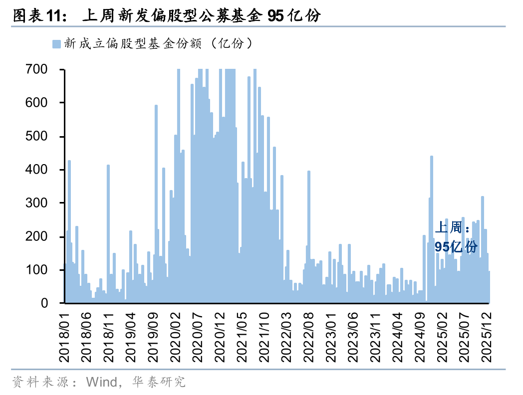 上周新成立偏股型基金95亿份,新发强度环比小幅回升,存量基金中,股票/混合基金权益仓位环比小幅回升。