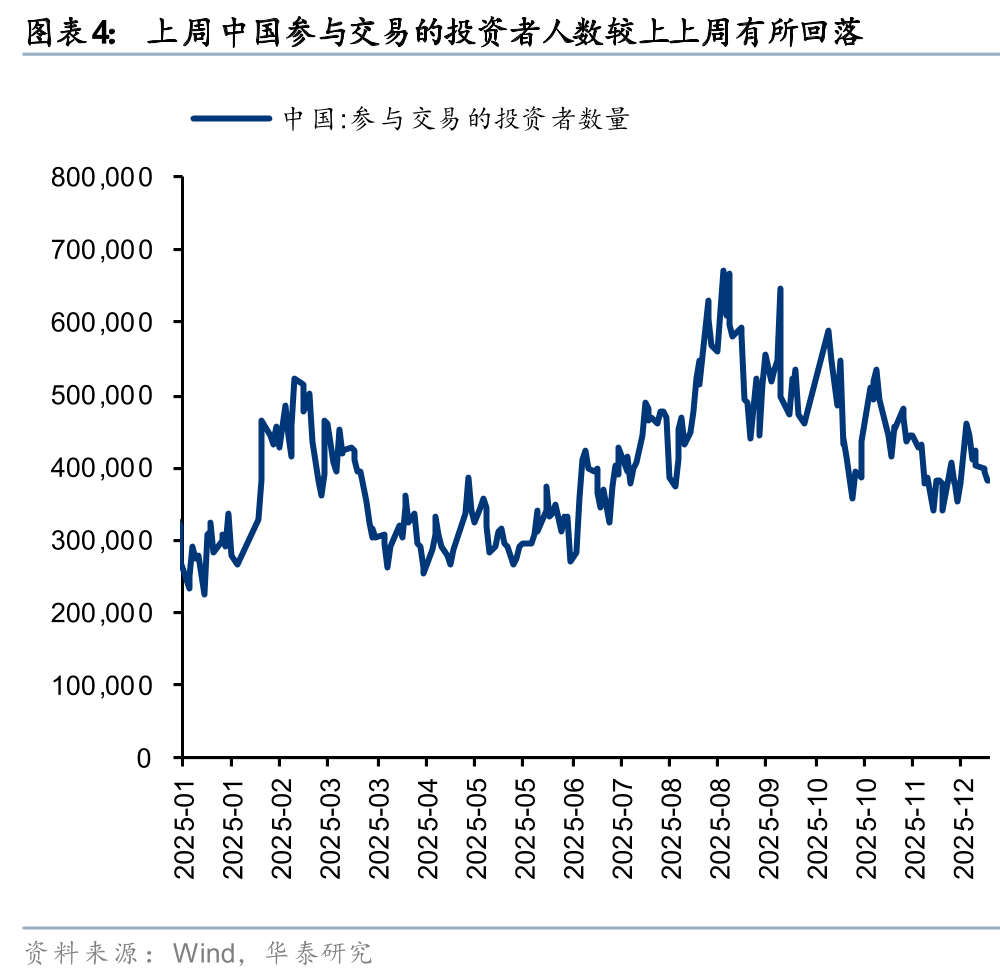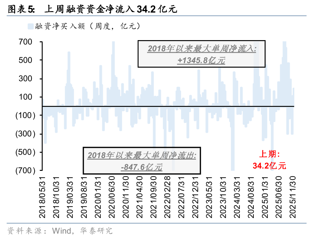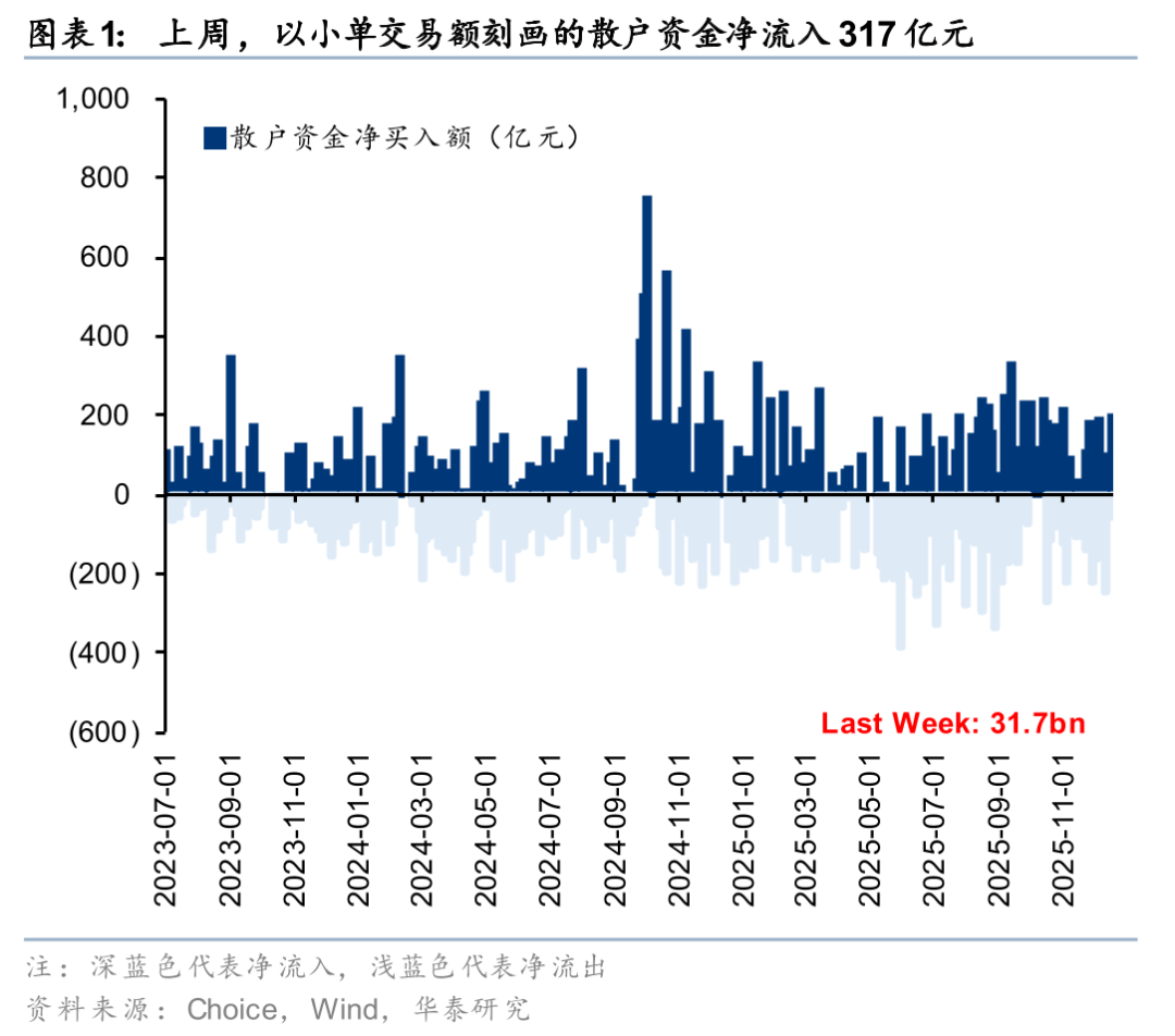 散户资金上周净流入317亿元。①数量角度,11月新增开户数238万户,环比2025年10月有所回升;②流量角度,2025年10月以来,散户资金再度转为净流出;③方向角度,上周散户资金净流入有色金属、医药生物、交通运输等行业,净流出机械设备、纺织服装、汽车等方向。