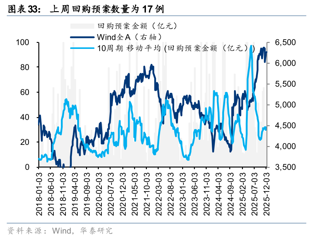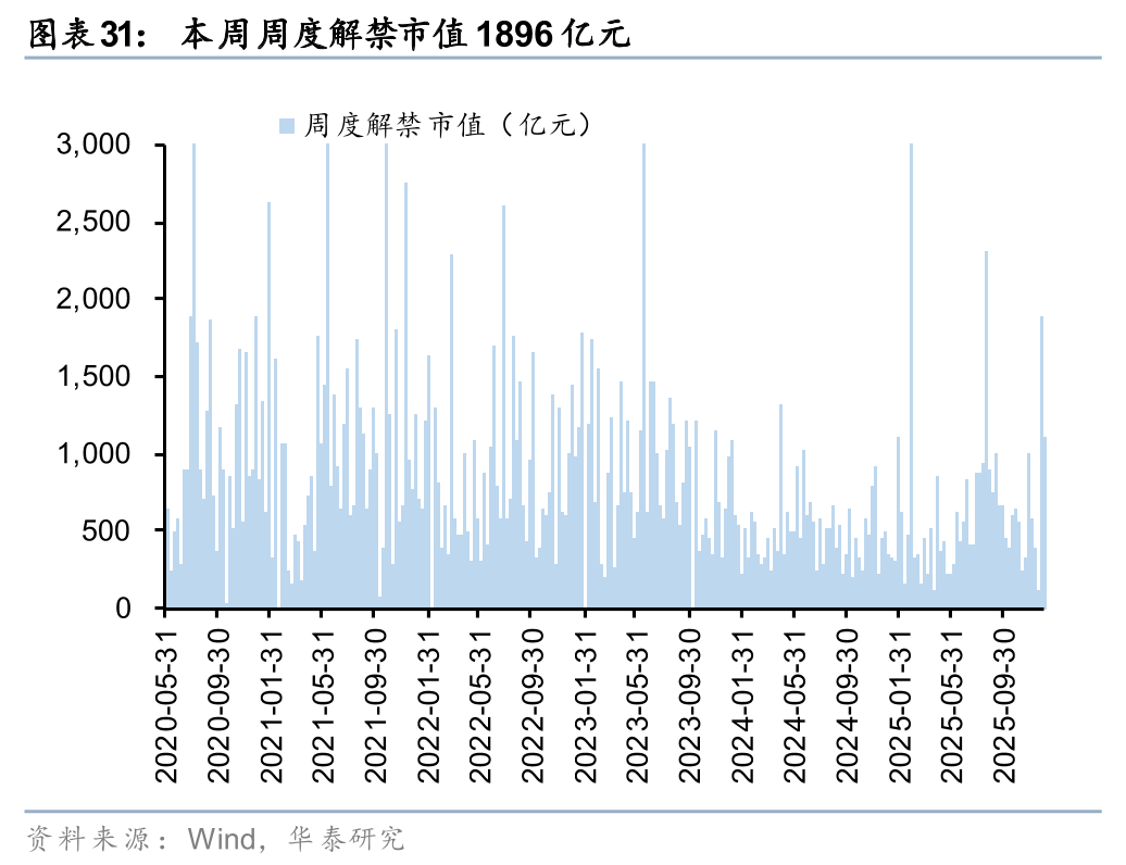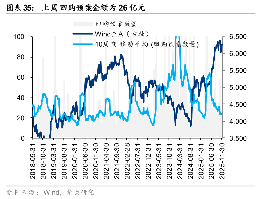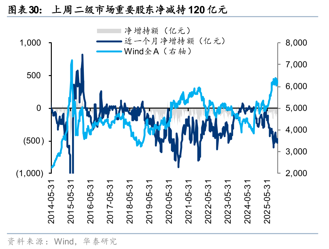上周二级市场重要股东净减持120亿元。解禁市值方面,本周解禁市值为1896亿元,供给端压力环比回升。回购方面,上周二级市场股票回购金额144亿元,回购预案金额为26亿元,回购金额环比上上周小幅回升。
