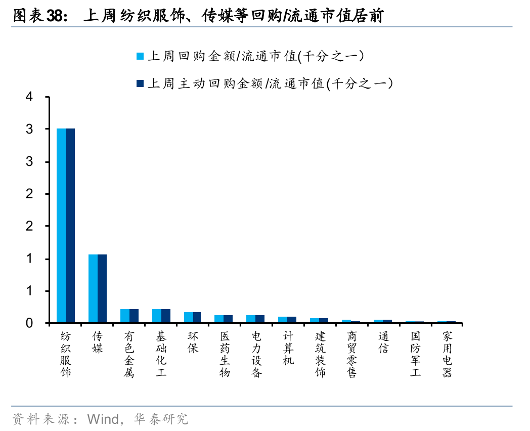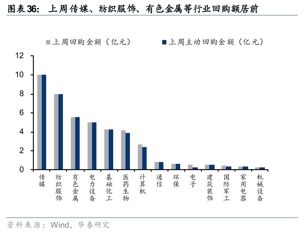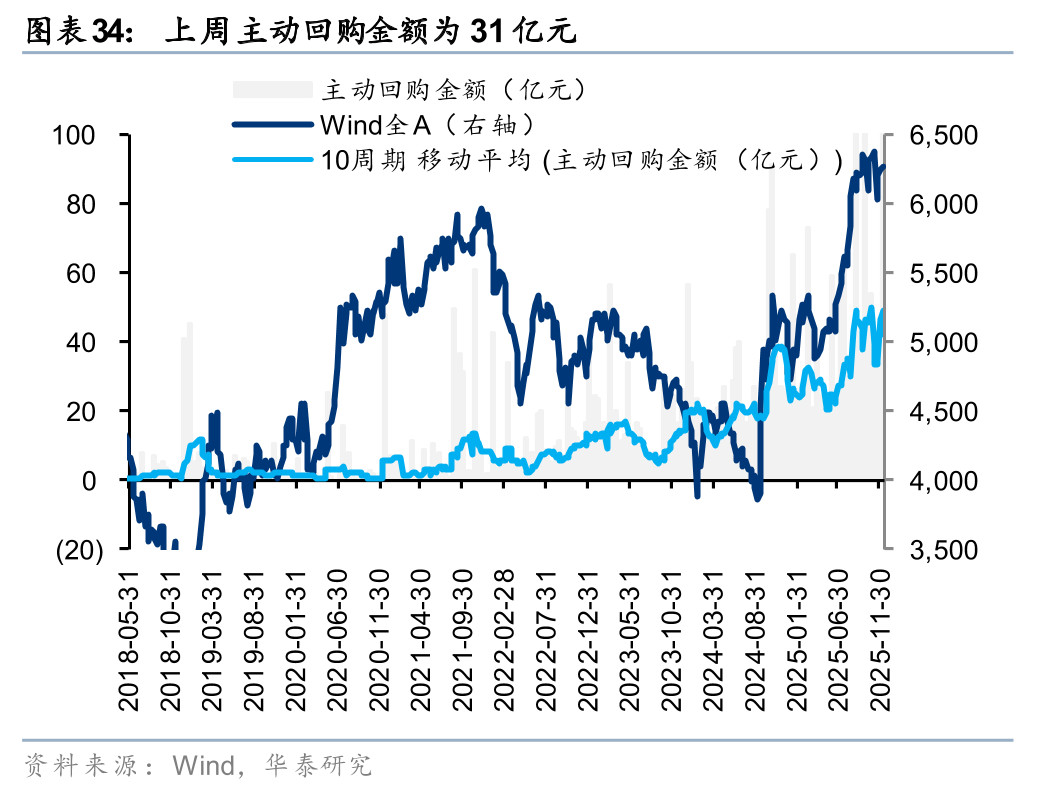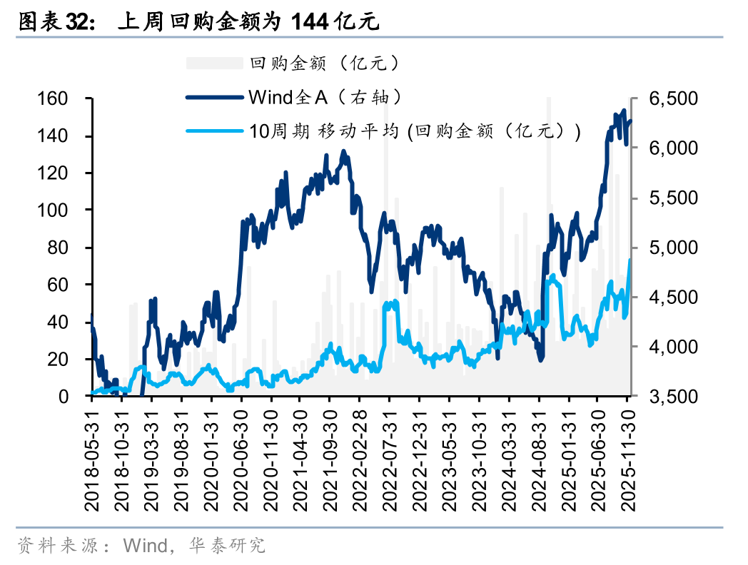 上周二级市场重要股东净减持120亿元。解禁市值方面,本周解禁市值为1896亿元,供给端压力环比回升。回购方面,上周二级市场股票回购金额144亿元,回购预案金额为26亿元,回购金额环比上上周小幅回升。
