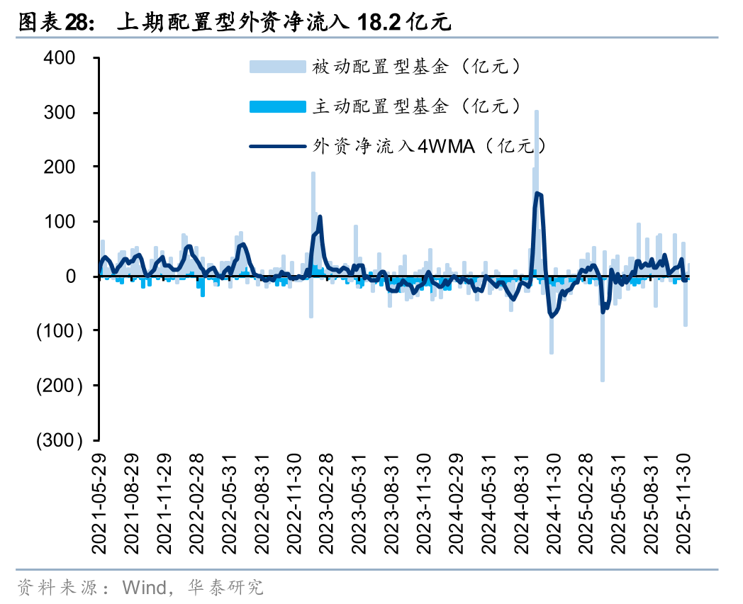 外资:以EPFR统计的配置型外资中,12月10日-12月17日,配置型外资净流入18.2亿元,其中主动配置型外资持续流出2.3亿元,被动配置型外资净流入20.5亿元。