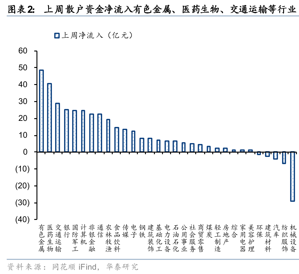 散户资金:上周散户资金净流入317亿元,环比转向净流入,净流入有色金属、医药生物、交通运输等行业,净流出机械设备、纺织服装、汽车等方向;