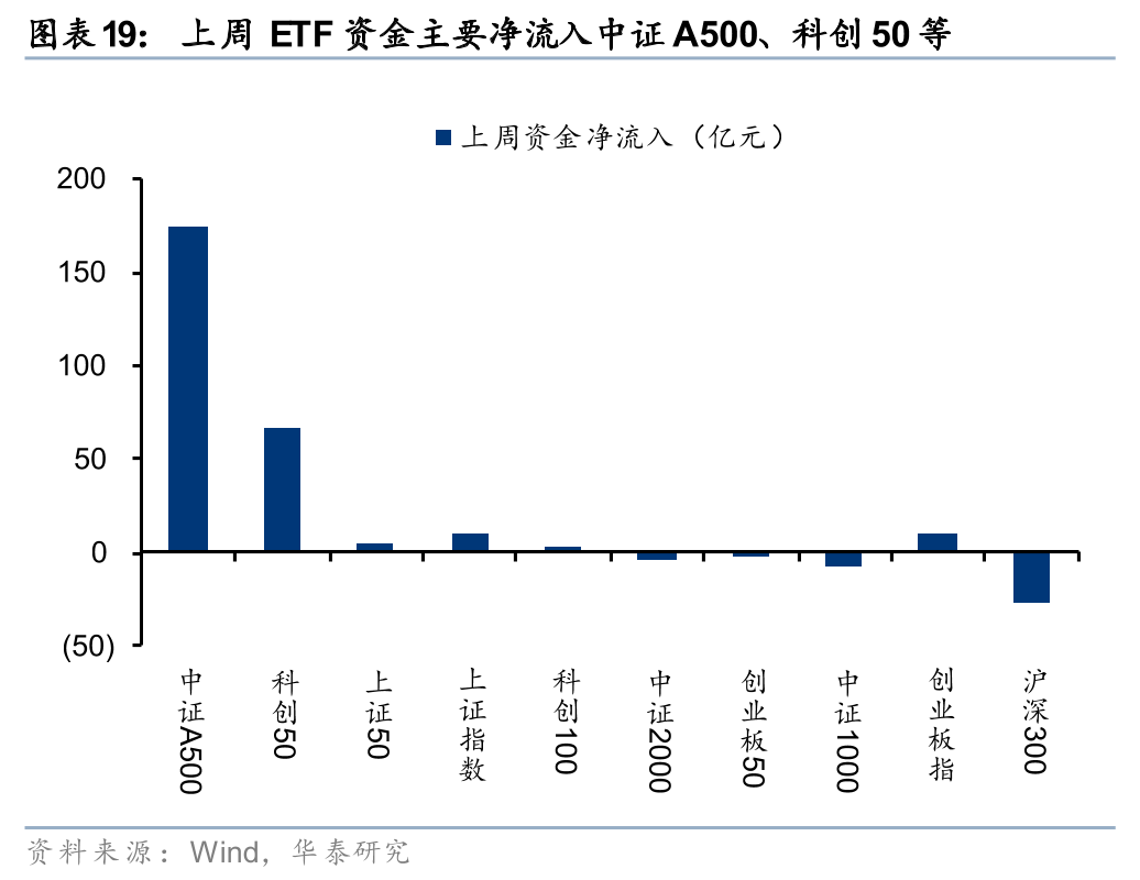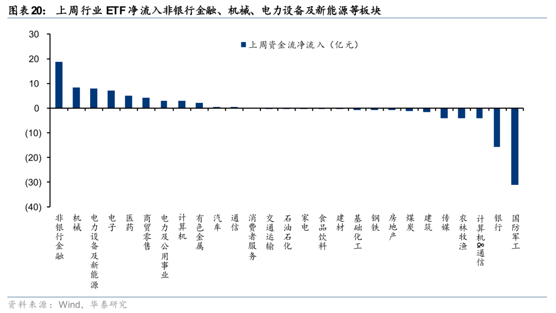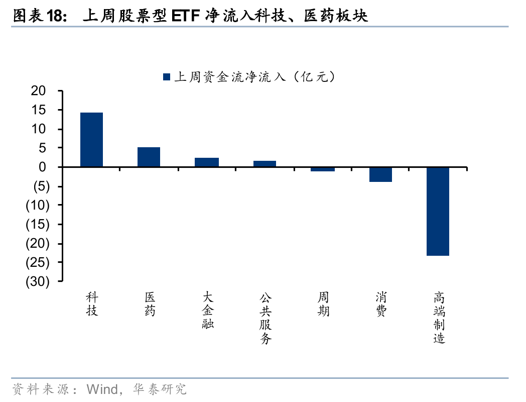 上周股票型ETF净申购340亿份,净流入264亿元,其中宽基ETF净流入232亿元,已连续净流入三周。分板块来看,科技、医药板块净流入规模居前,行业中非银行金融、机械、电力设备及新能源等行业净流入居前。