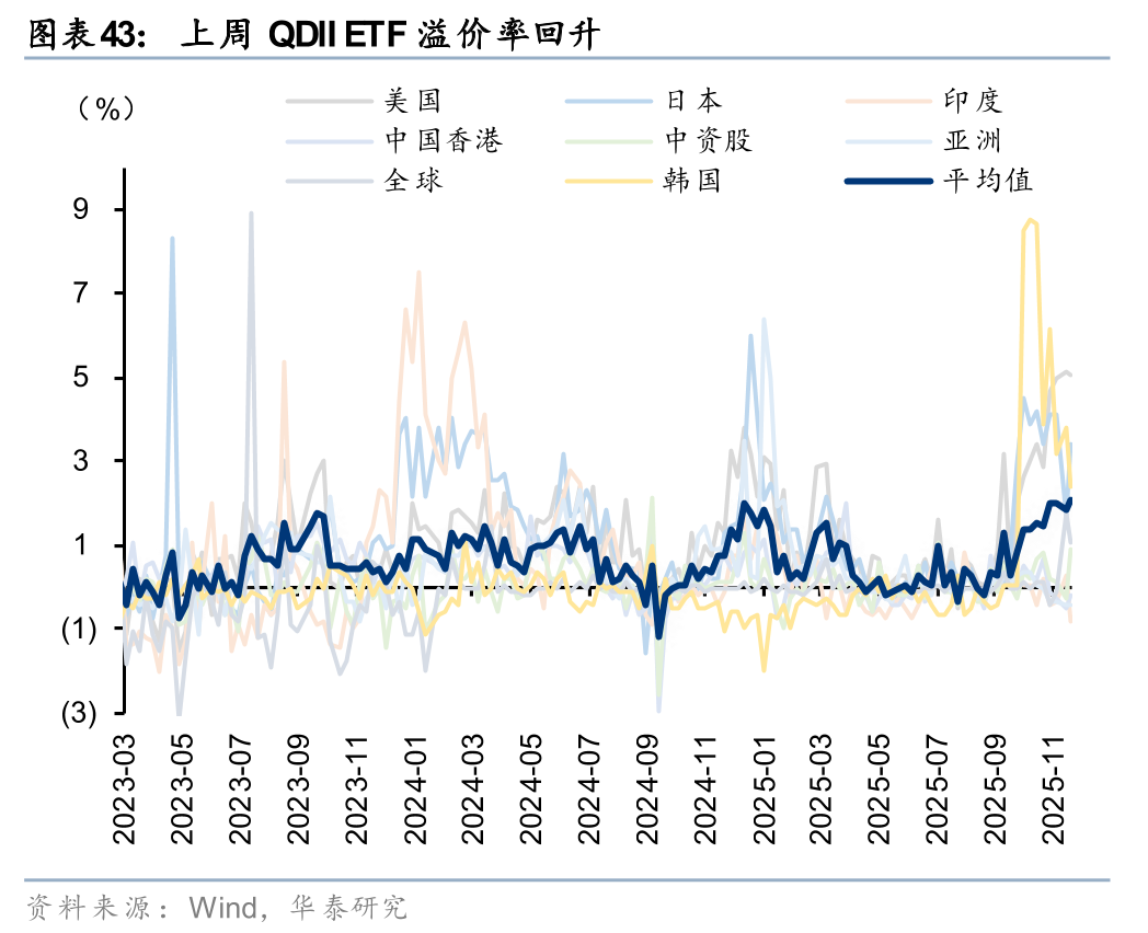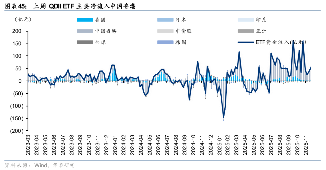 QDII ETF上周净流入56亿元,主要净流入中国香港。从溢价率来看,QDII ETF溢价率环比回升。
