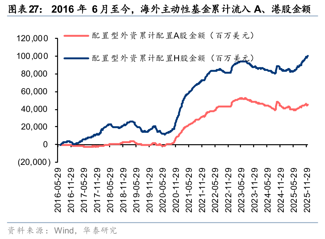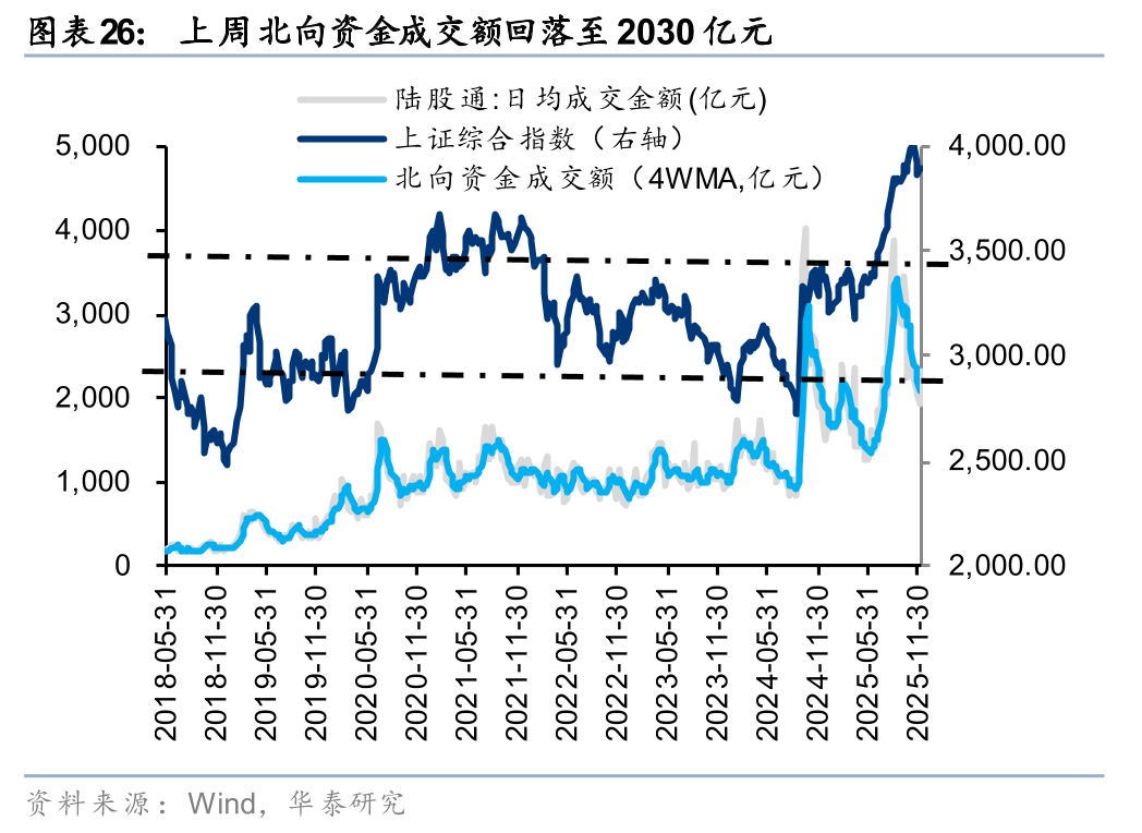 上周北向资金日均交易额回落至2030亿元。以EPFR统计的配置型外资中,12月10日-12月17日,配置型外资净流入18.2亿元,其中主动配置型外资持续流出2.3亿元,被动配置型外资净流入20.5亿元。
