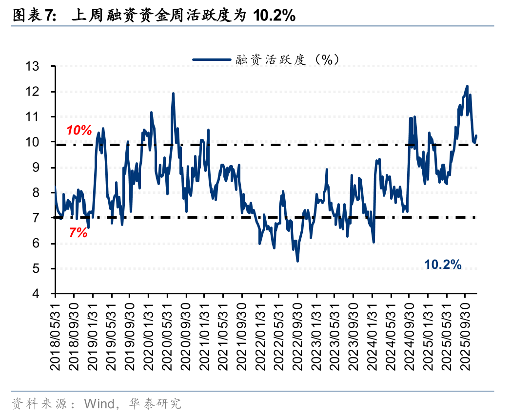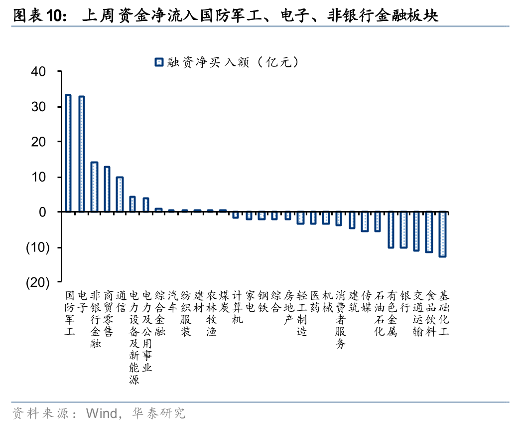 融资资金上周净流入34亿元,融资交易活跃度环比小幅回落。①上周融资资金流入34亿元,②融资交易活跃度为10.2%,③上周市场平均担保比例为272%,环比小幅回落,④结构上,融资资金净流入国防军工、电子、非银行金融等板块,净流出基础化工、食品饮料、交通运输等板块。