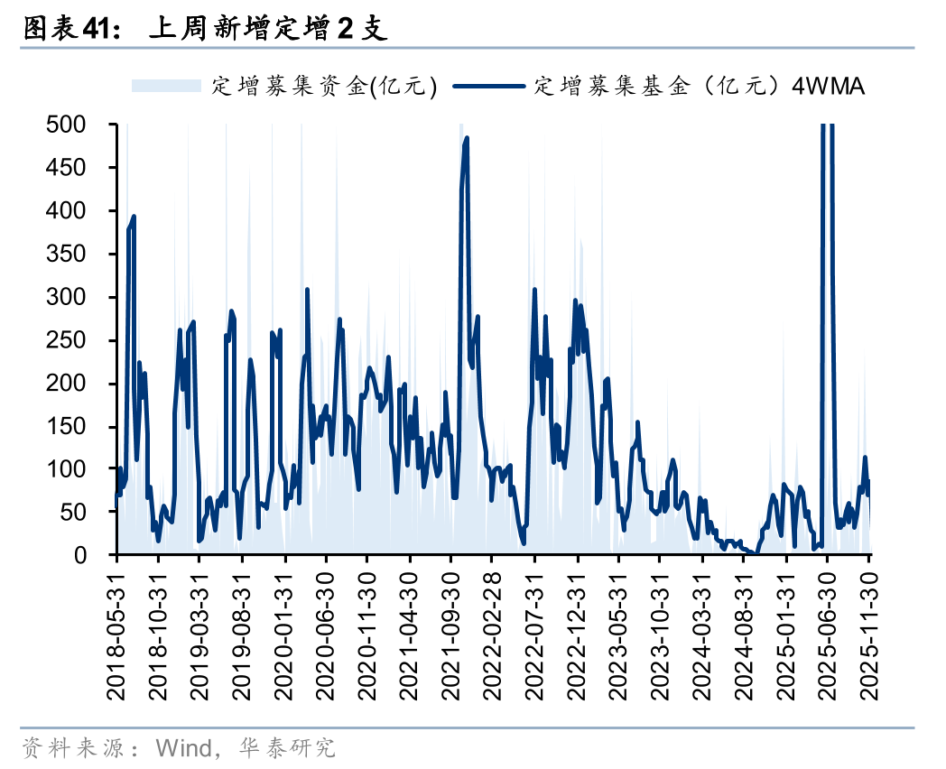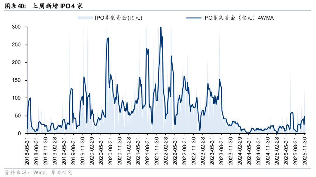 上周一级市场募资金额环比回升。上周新增IPO 4家,首发募集资金77.8亿元;上周新增定增2支,募资21.23亿元,暂无新增可转债。