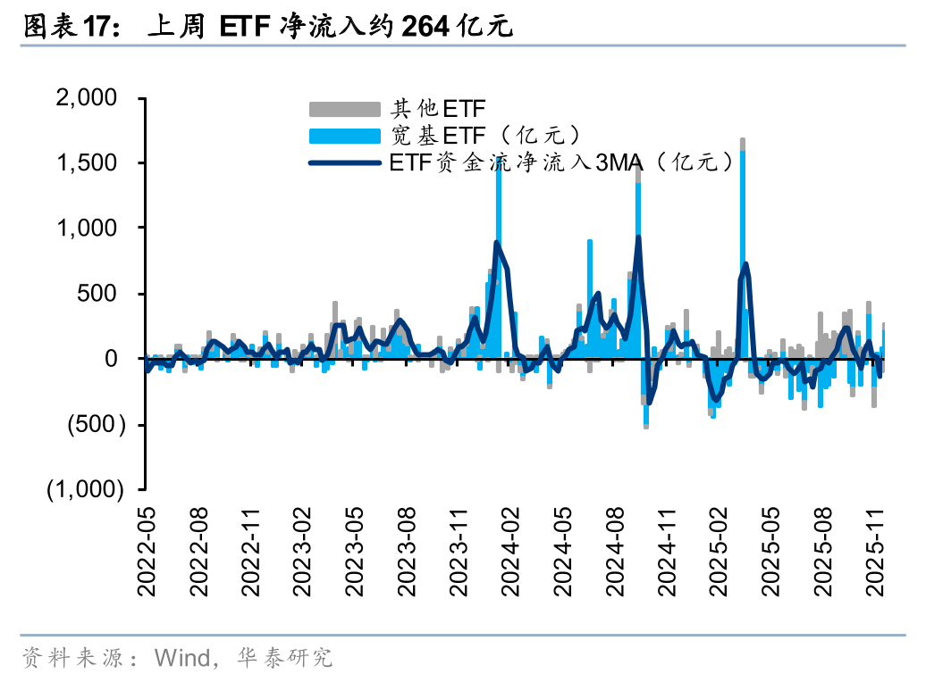 上周市场走出“V”型行情,流动性视角,宽基ETF等左侧资金流入提振散户情绪或为上周资金层面的主要拐点,沪深300ETF产品于上周后半周净流入或表明市场在阶段性低位仍具备一定资金韧性。向后看,我们认为:1)险资开门红预期下,或仍具备增仓A股的动能;2)圣诞假期后外资是否回补A股影响行情斜率抬升的幅度;3)关注主题行情对交易型资金流入的催化。