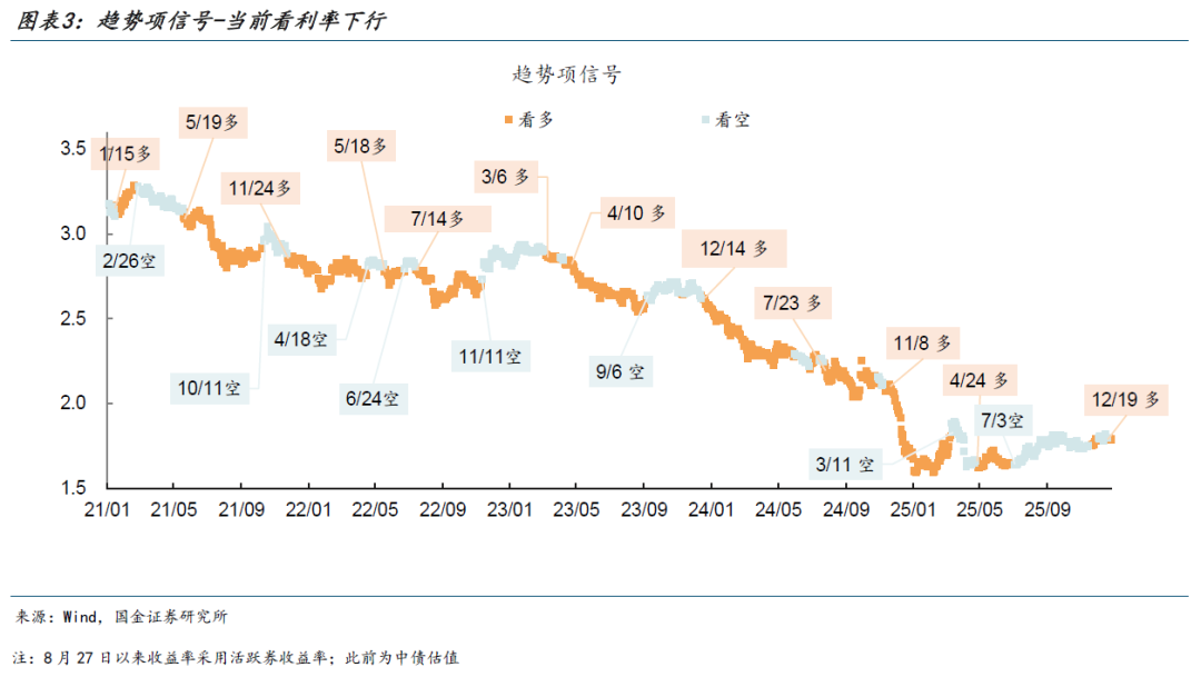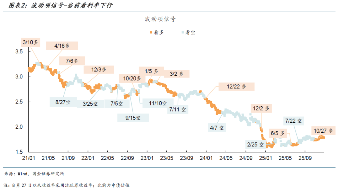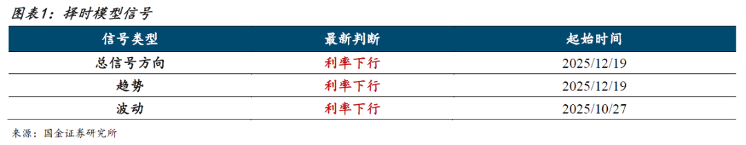 模型信号解读:波动信号由2025年10月27日开始看利率下行,趋势信号由2025年12月19开始看利率下行,模型总体看利率下行。本信号为量化模型客观运行结果,谨供参考。