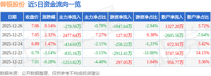 12月26日的资金流向数据方面,主力资金净流出279.56万元,占总成交额0.78%,游资资金净流出1047.64万元,占总成交额2.94%,散户资金净流入1327.2万元,占总成交额3.72%。