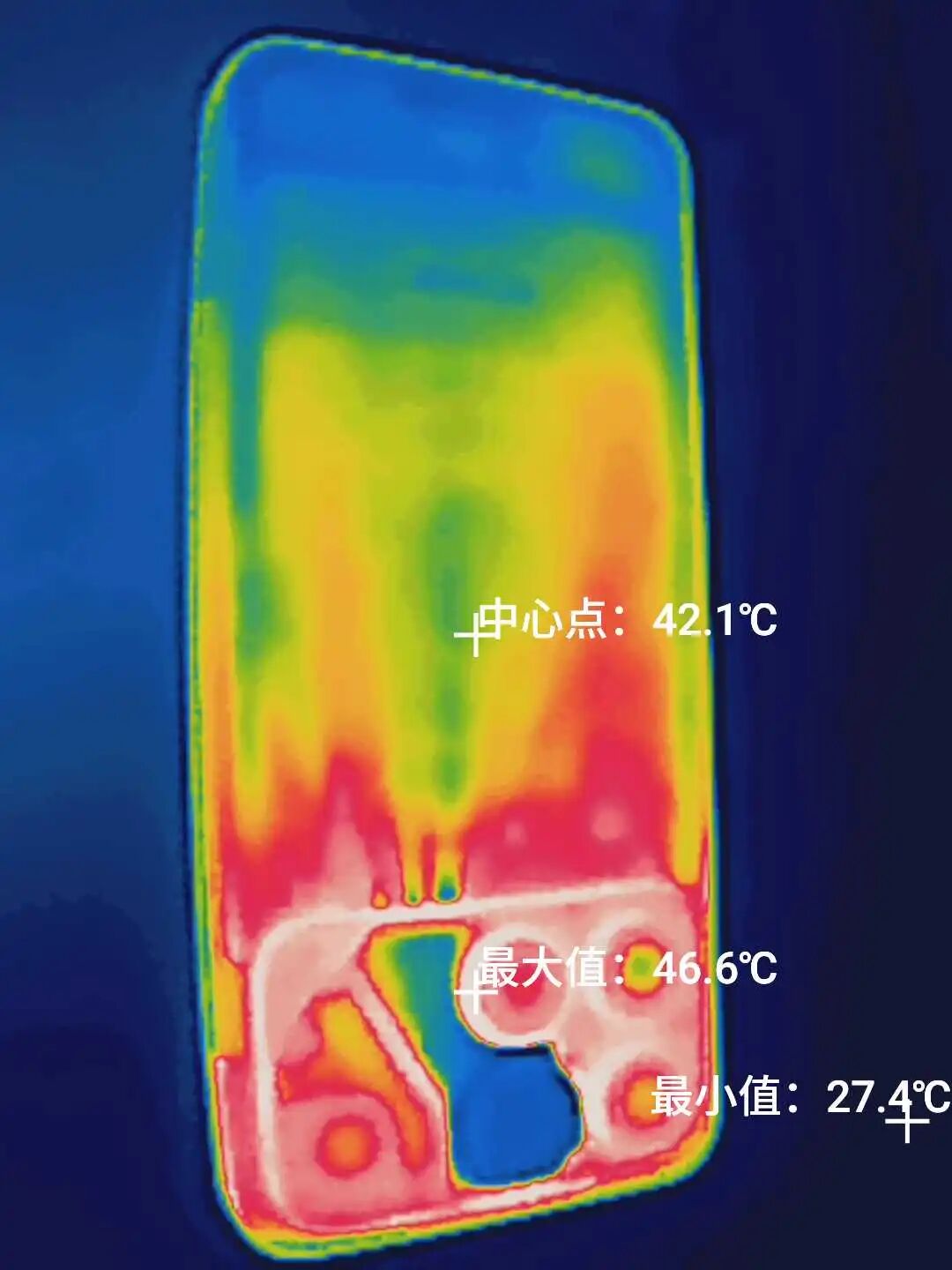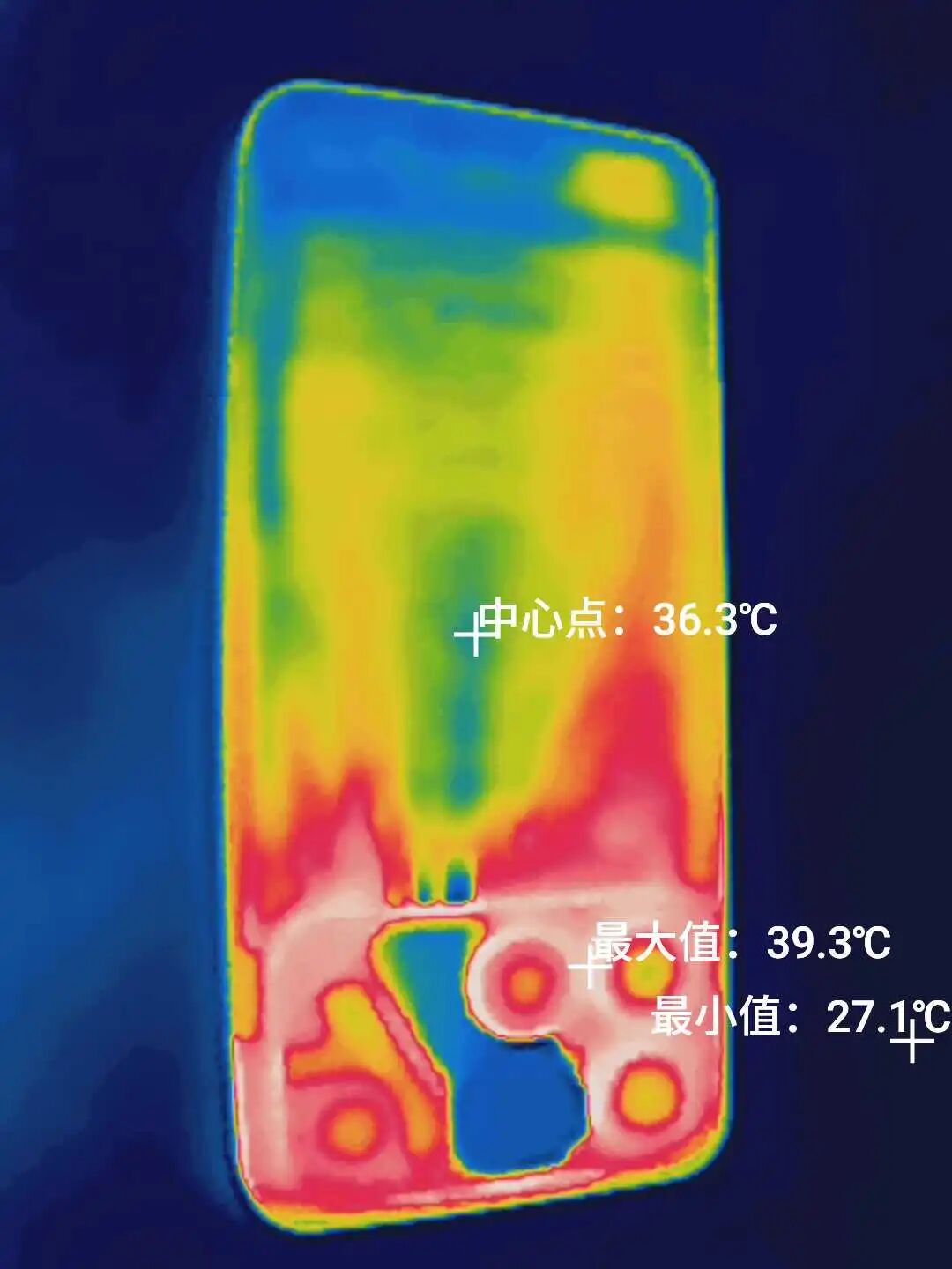 而机身背面最高温度连 40 度都不到,从测温图也能看出来风扇和风道是一大片蓝色,跟机身其他区域形成鲜明对比,这风扇有事儿是真上啊。。。
