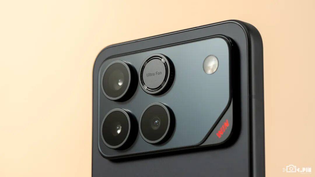 机身背部采用抗指纹的磨砂玻璃工艺,手感非常不错,镜头模组也很规整,把风扇完美融入了进去,只在角落有一个 WIN 的 LOGO 。