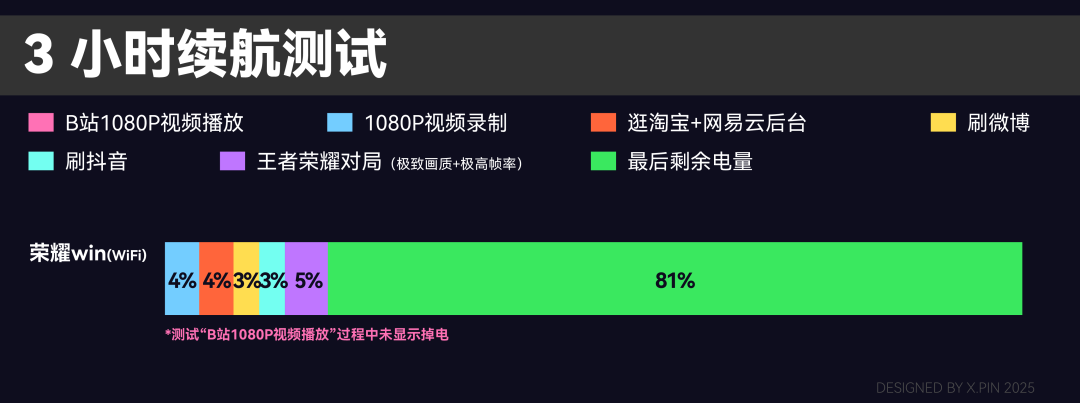 嗯。。。至少在我们的三小时续航测试下,荣耀 WIN 剩余电量 81% ,强一点,但不多。