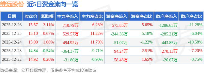12月26日的资金流向数据方面,主力资金净流入710.79万元,占总成交额6.23%,游资资金净流入575.85万元,占总成交额5.05%,散户资金净流出1286.65万元,占总成交额11.28%。