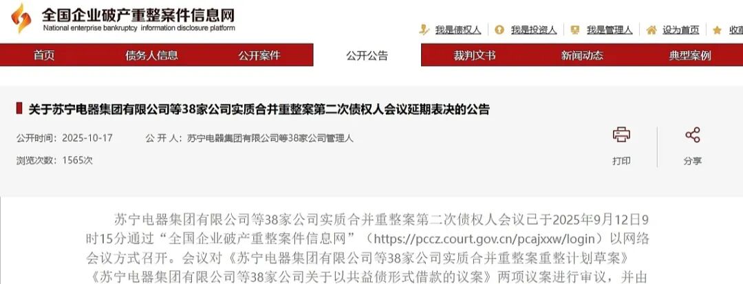 三次延期之后,最新消息“苏宁电器集团有限公司等38家公司实质合并重整草案”表决已落地,草案经南京中院确认顺利通过,并同步核准了80亿元共益债借款议案,将正式进入信托清偿阶段。