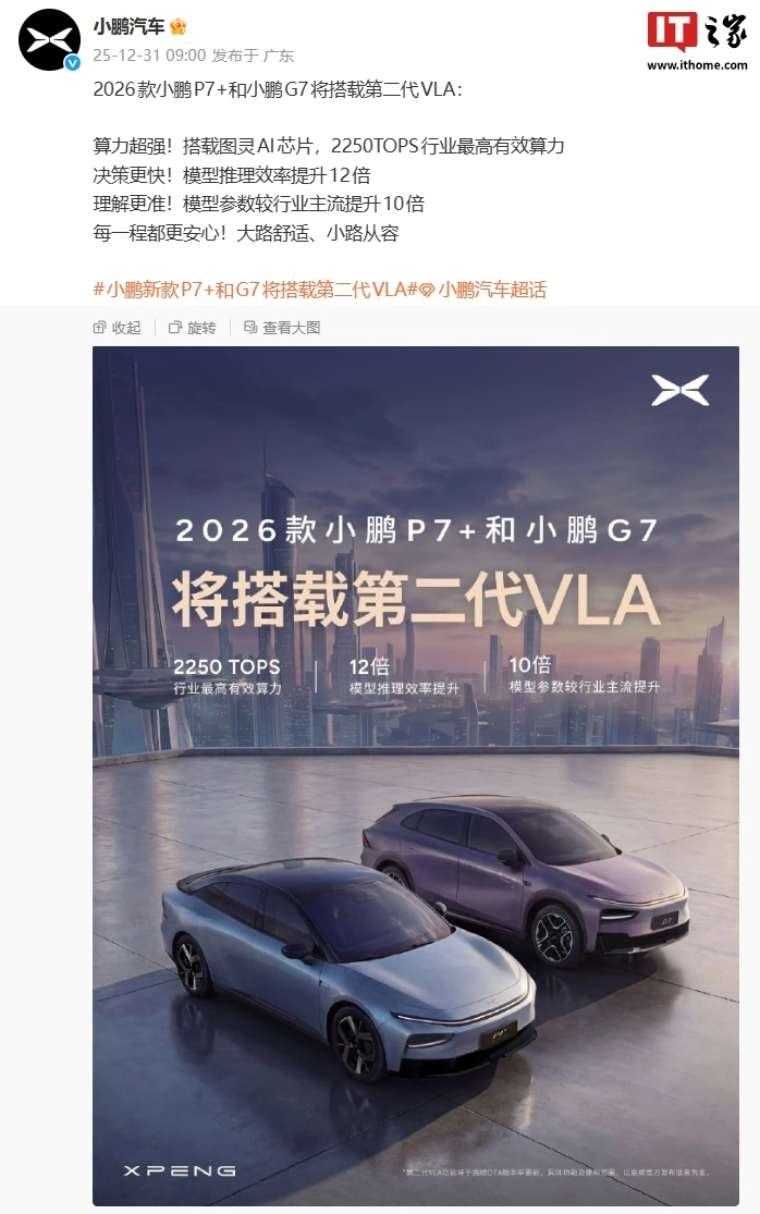 IT之家 12 月 31 日消息,小鹏汽车官方今日继续预热 2026 款小鹏 P7+ / G7 车型,宣布 2026 款小鹏 P7+ 和小鹏 G7 将搭载第二代 VLA: