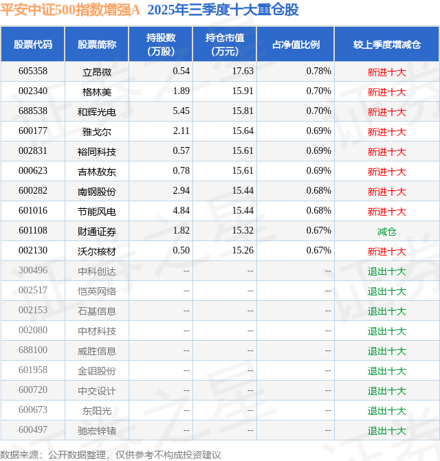 平安中证500指数增强A的前十大重仓股如下: