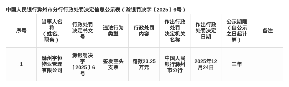 罚单显示,滁州宇恒物业管理有限公司的主要违法违规事实为:签发空头支票。
