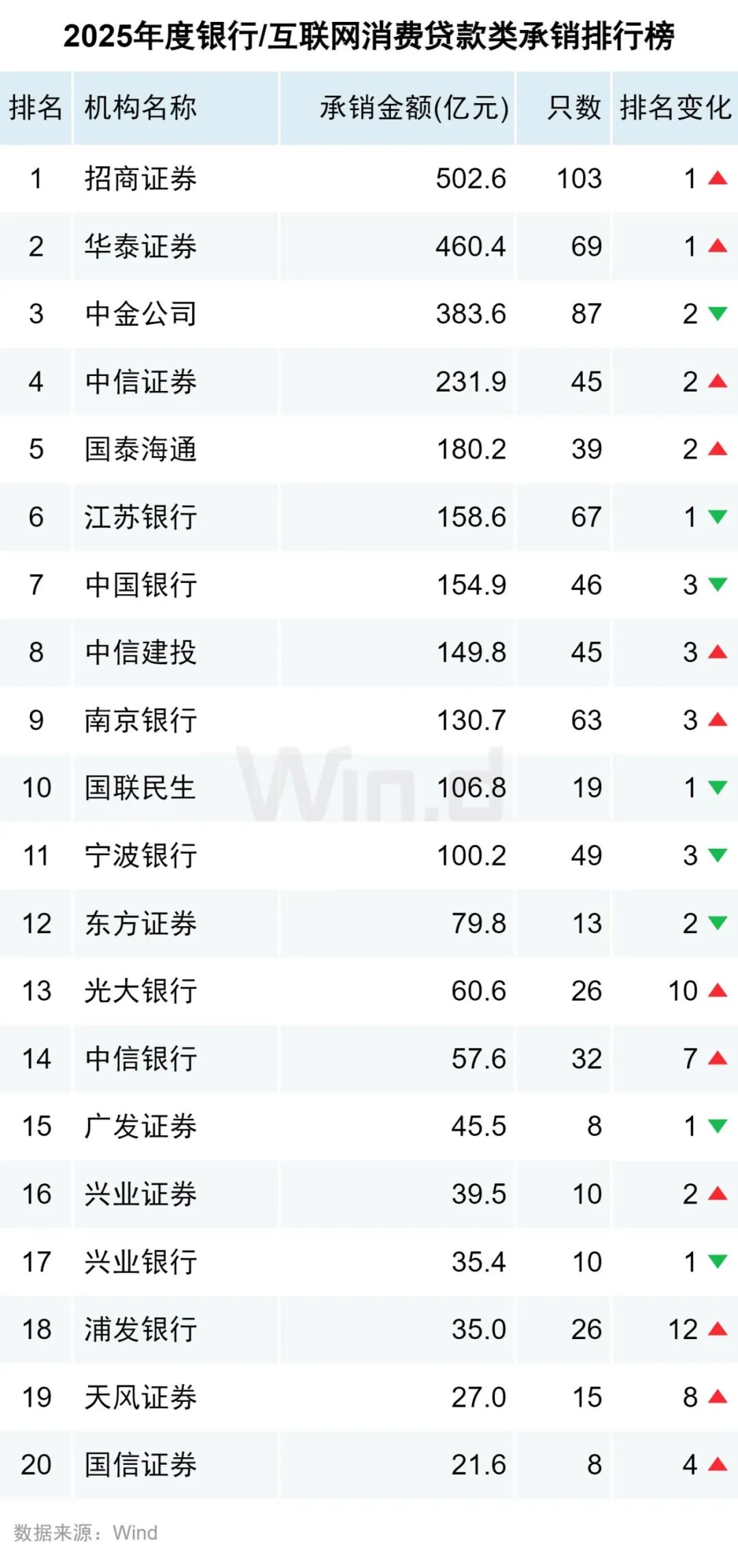 招商证券承销502.6亿元,领跑2025年度银行/互联网消费贷款类承销排行榜;华泰证券承销460.4亿元,跃居第二;中金公司承销383.6亿元位列第三。