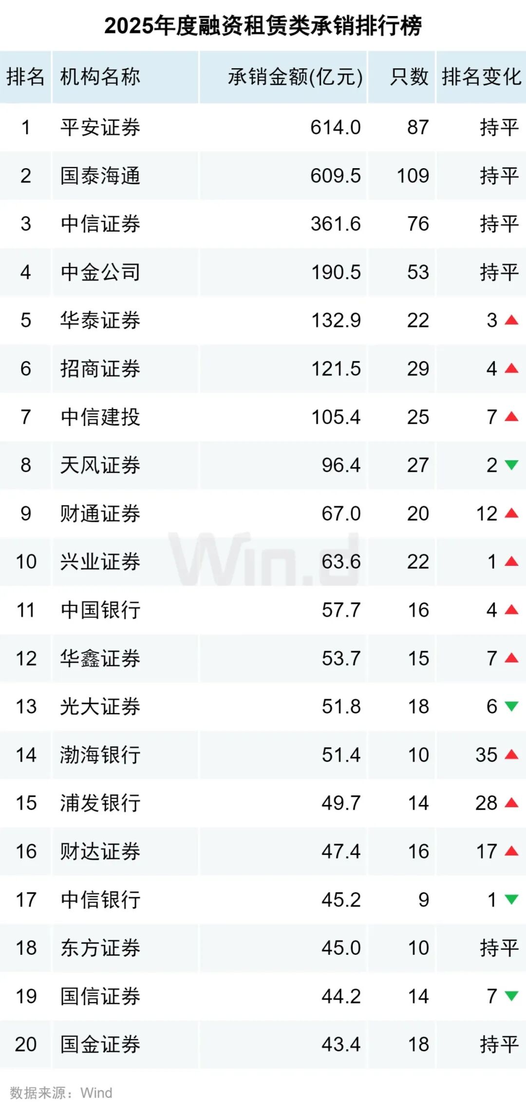 平安证券承销614.0亿元,位居榜首;国泰海通、中信证券位列二三。