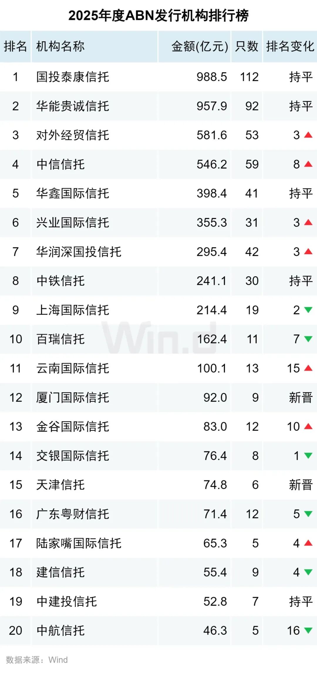 国投泰康信托发行988.5亿元排名第一;位列第二、第三位的是华能贵诚信托(957.9亿元)和对外经贸信托(581.6亿元)。