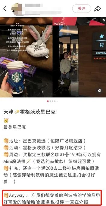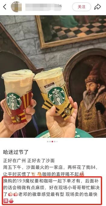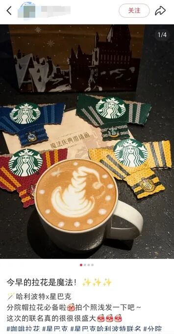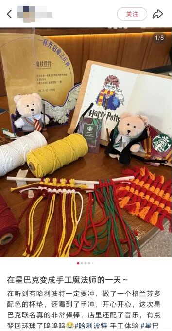 许多“哈迷”就分享到,星巴克咖啡师总会主动介绍限定饮品、周边和互动装置玩法,还有咖啡师把私藏的“巫师袍”穿到现场COS互动、向顾客借出自己的魔杖。