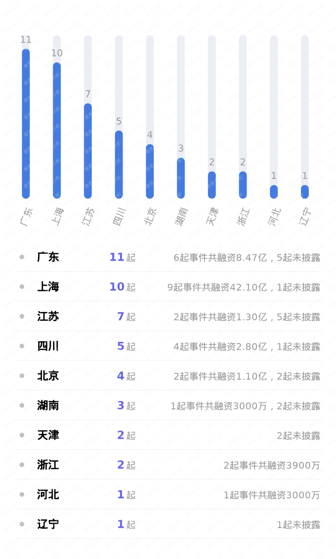 从本周披露获投企业的地区分布来看,主要集中在广东、上海、江苏。 其中广东披露11个,上海披露10个,江苏披露7个。