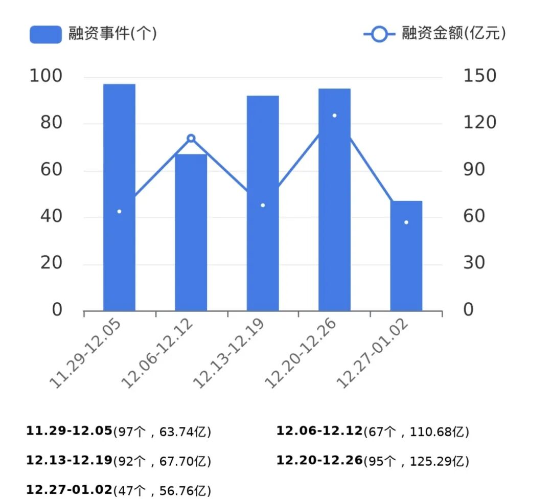 根据睿兽分析监测数据,本周国内一级市场披露的融资事件47个, 与上周相比减少48个, 其中已披露融资金额的事件27个, 总融资规模为56.76亿元人民币, 平均融资金额为2.10亿元人民币。
