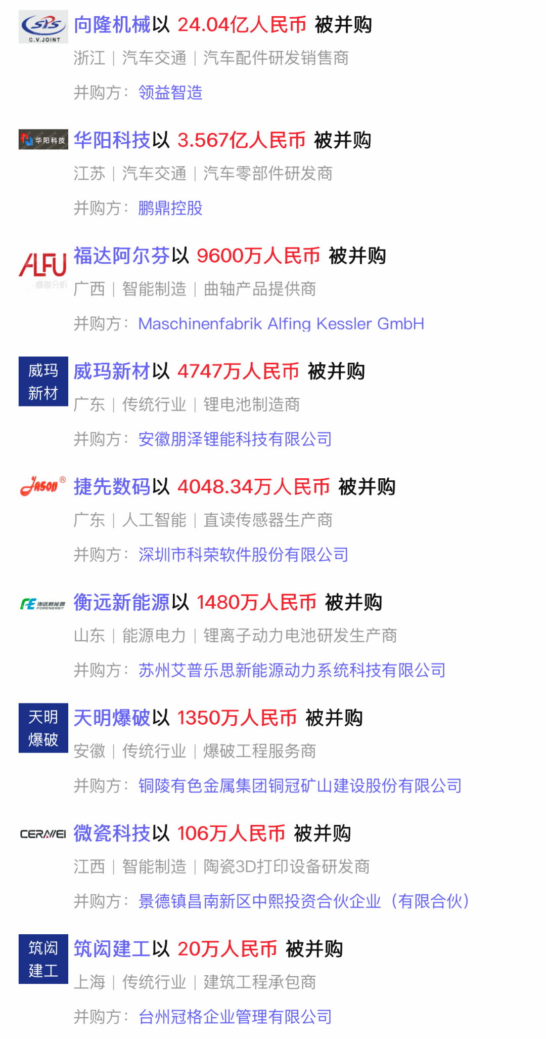 本周国内披露已完成的并购事件11个,与上周相比减少9个,分布在传统行业、智能制造、汽车交通行业。其中,领益智造以24.04亿人民币收购汽车配件研发销售商向隆机械96.15%股份。被收购方浙江向隆机械是一家集自主研发、设计、制造于一体的公司,专业生产汽车等速驱动轴、传动轴、等速万向节。 曾获得领益智造等机构投资。