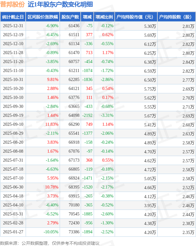 从股价来看,2025年12月19日至2025年12月31日,普邦股份区间跌幅为6.9%,在此期间股东户数减少75.0户,减幅为0.12%。